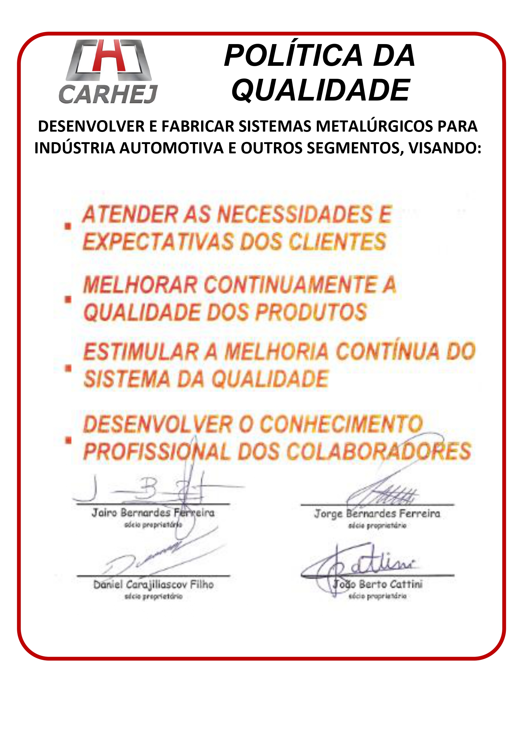 QUALIDADE: Atender as expectativas dos clientes através da satisfação dos envolvidos no negócio.
